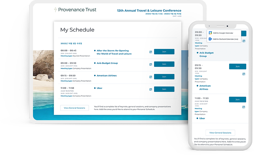 OE Passport 웹 애플리케이션은 모든 참석자와 발표자에게 고도로 개별화된 회의와 회의 일정을 제공합니다.